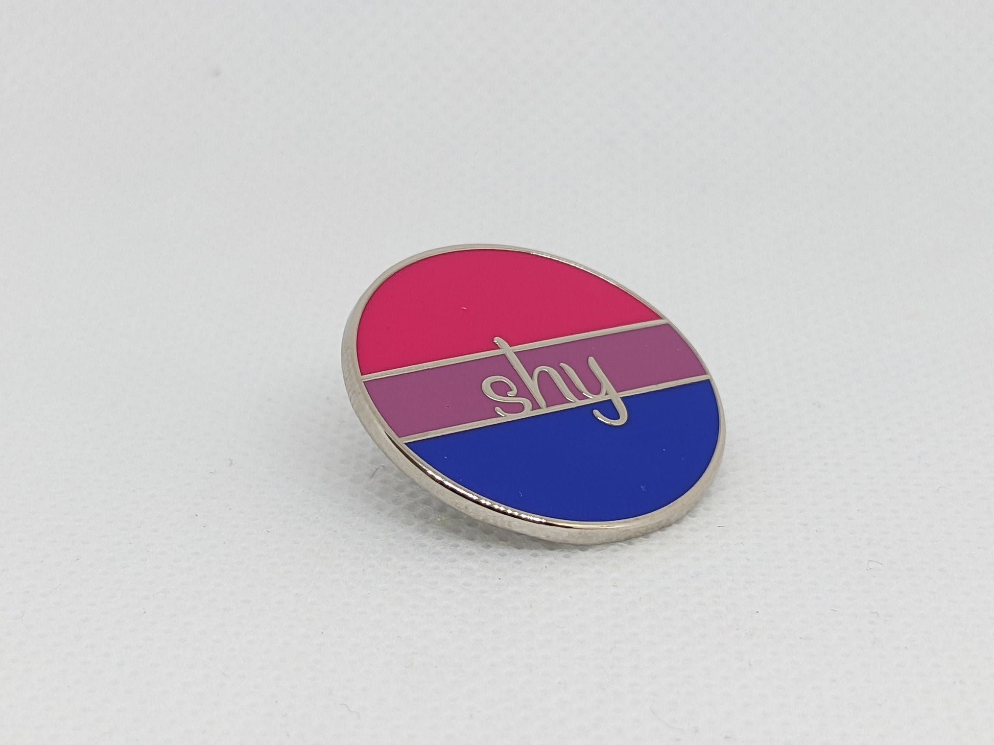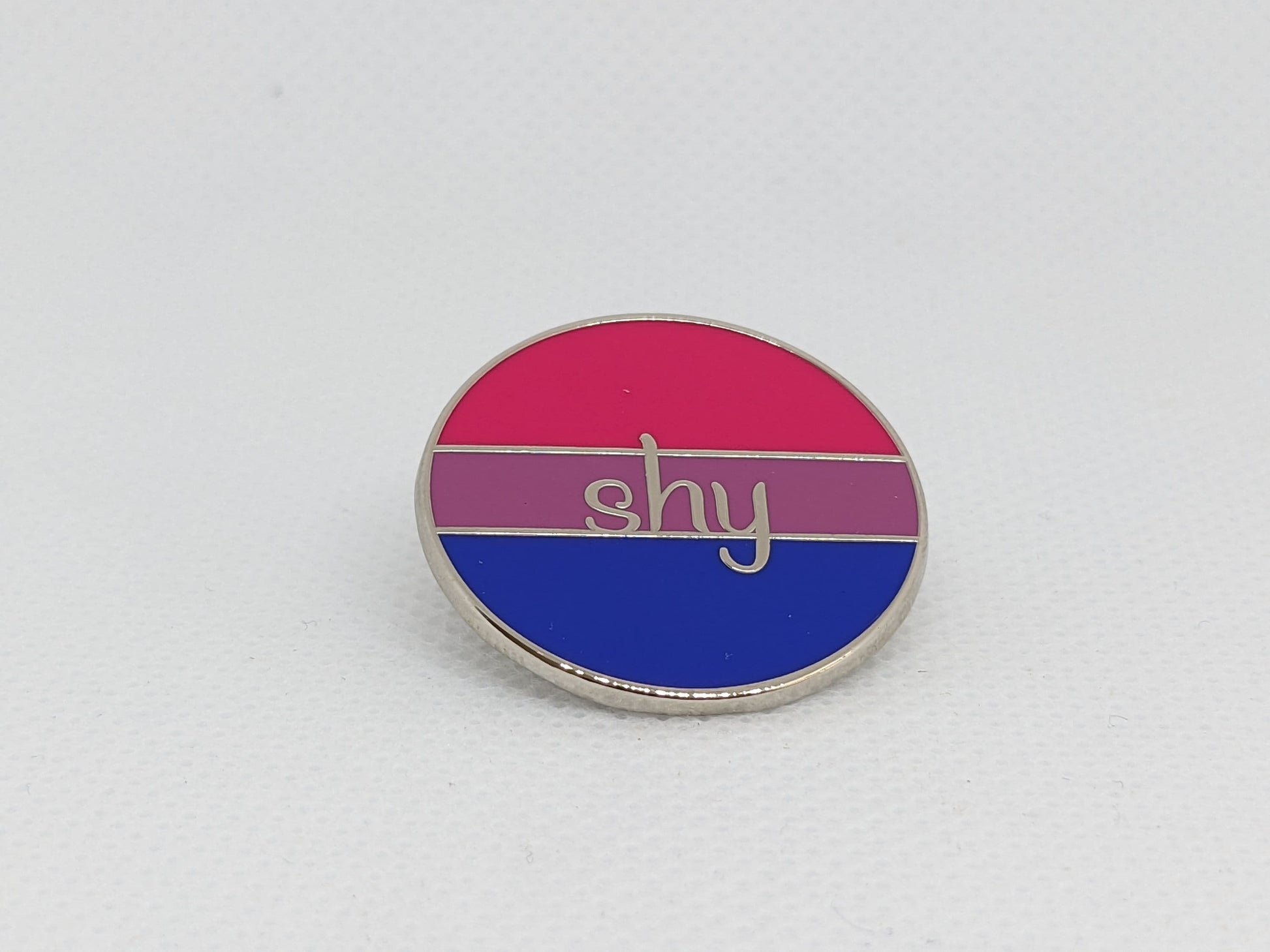 Each pin depicts the words "Shy" in front of the bi pride flag colors.